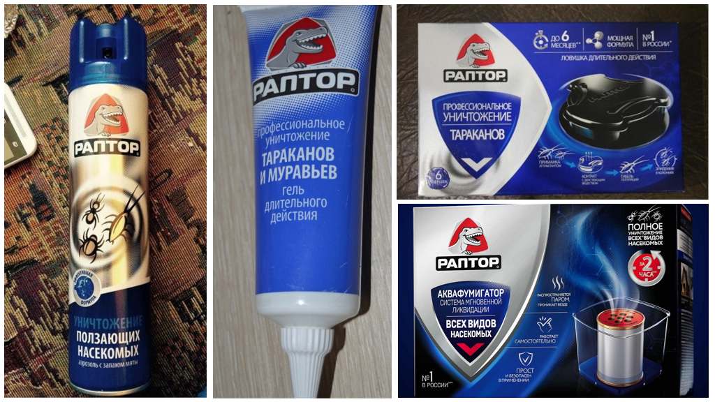 Ang kumpanya ay gumagawa ng mga paghahanda ng Raptor laban sa mga ipis sa anyo ng mga gels, traps, aerosol. Ang mga likidong sprays ay kumilos kaagad, dinisenyo para sa kumpletong, bahagyang disinsection ng tirahan na lugar. Gels, traps - matagal na pagkilos. Ginamit para sa pag-upo ng mga insektopag-iwas sa kanilang hitsura. Kapag nagtatrabaho sa mga sangkap ng insecticidal, guwantes na goma, isang respirator, isang gasa na bendahe sa kaso ng isang aerosol ay dapat na magsuot.